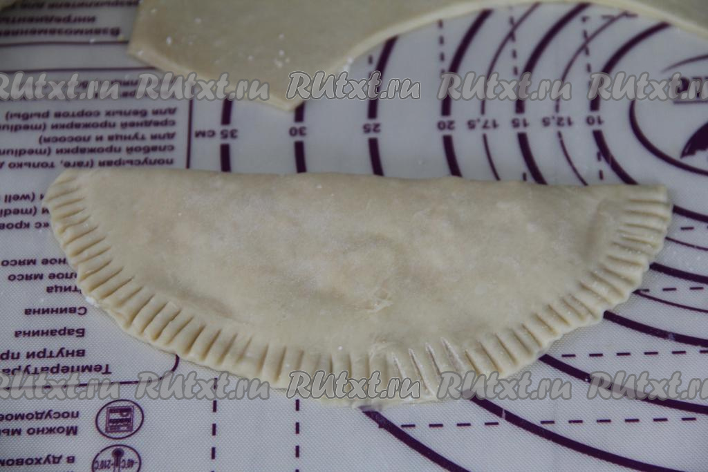 Тщательно скрепить края чебурека. Края чебурека я хорошо прижала вилкой, сформировав фигурный край. Постепенно сформировать все чебуреки.