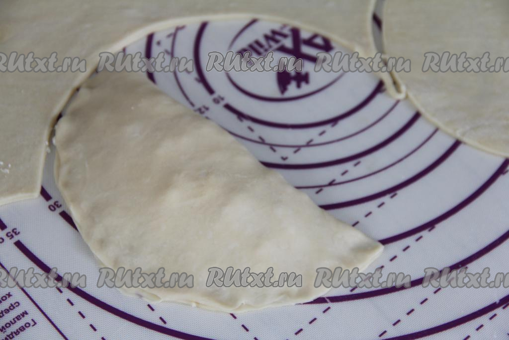 Чистым краем круга накрыть сторону круга с начинкой, формируя чебурек с творогом и сыром.