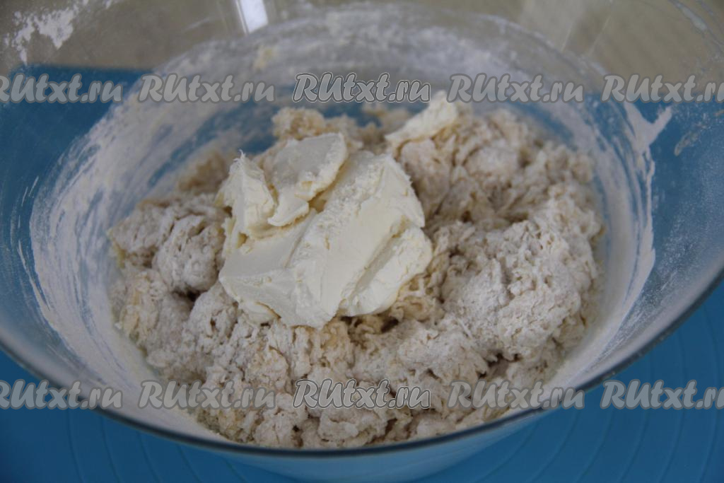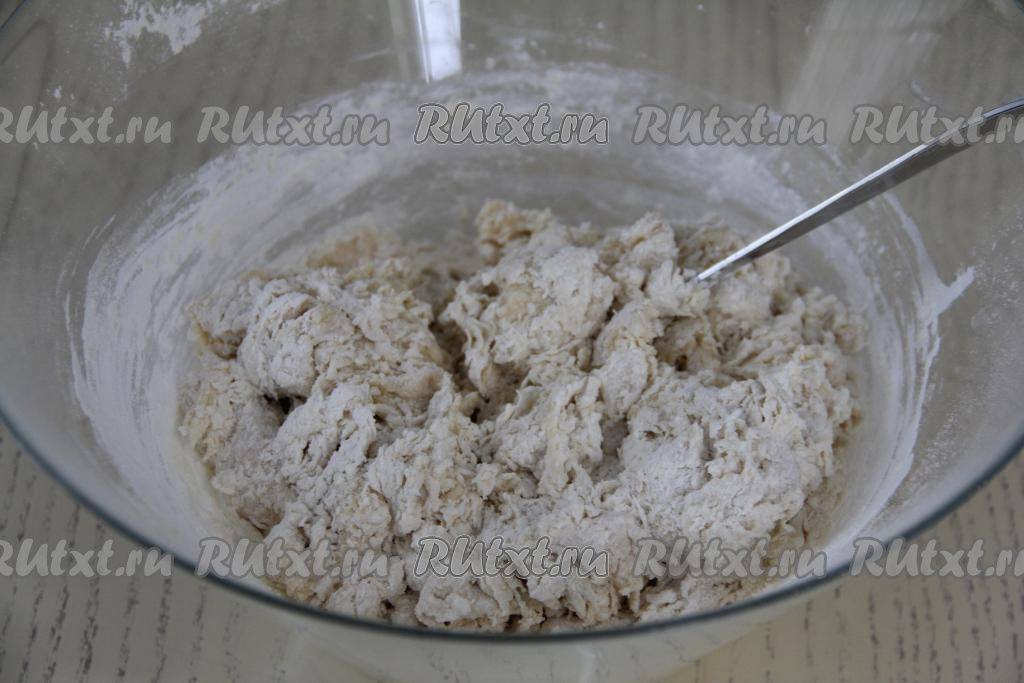 Вмесить масло в тесто. Переложить тесто на рабочую поверхность, припылённую мукой, и вымесить руками в течение 7-10 минут (до гладкого и мягкого состояния). Тесто должно практически не липнуть к рукам.