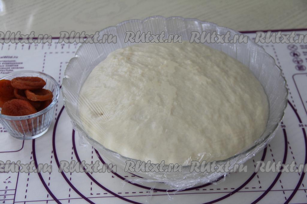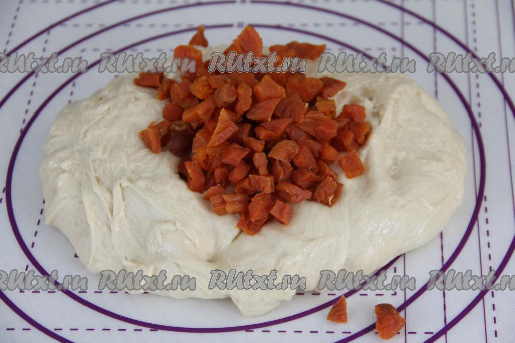 Хорошо обмять тесто, выложить на стол, добавить курагу, нарезанную на небольшие кусочки. Вмешать курагу в тесто руками.