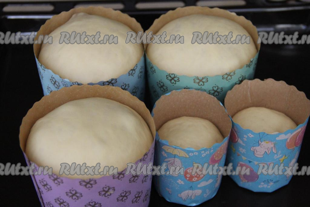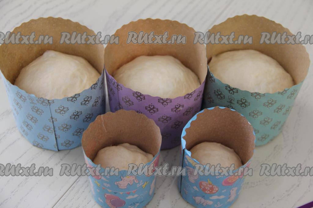 Разделить тесто на части и выложить в формы для куличей, заполняя их на половину объёма. У меня получилось 3 кулича по 350 грамм и 2 мини куличика. Формы с тестом прикрыть полотенцем и оставить в тёплом месте на 1 час для подъёма теста.