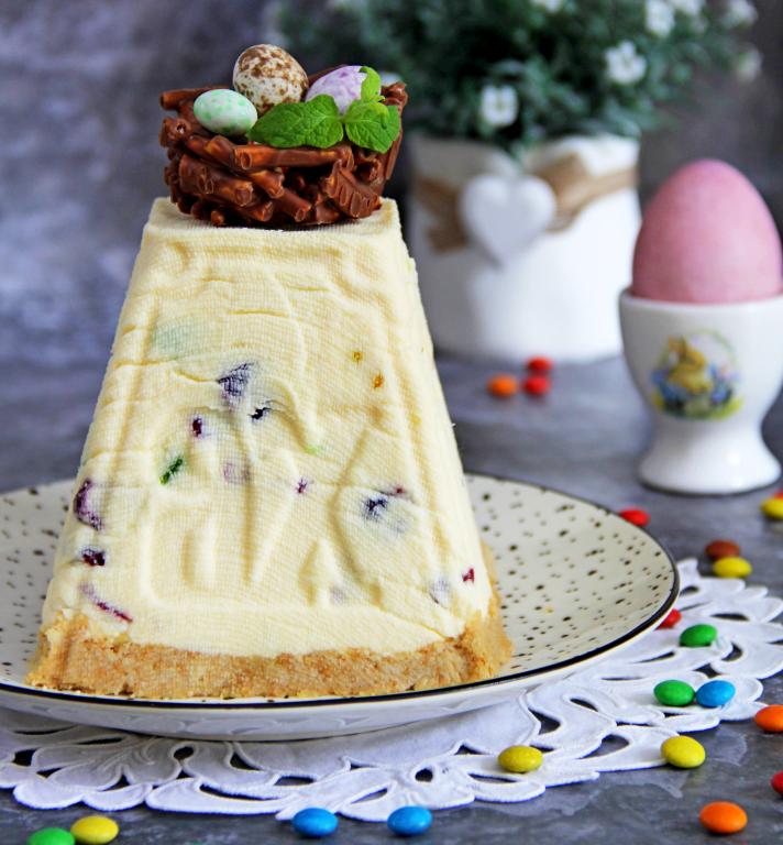 Готовую заварную творожную пасху со сливками перевернуть на тарелку, снять форму и марлю. А затем украсить (я украсила гнёздышком с яйцами) и подать к столу. Эта нежная, в меру сладкая пасха станет достойным украшением пасхального стола, а её вкус, наверняка, приятно порадует и вас, и ваших близких!