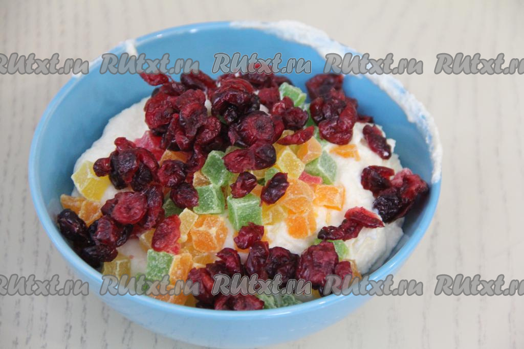 В творожно-заварную массу добавить цукаты и клюкву (вместо клюквы можно добавить предварительно залитый на 5 минут кипятком, а затем обсушенный изюм). Перемешать массу.