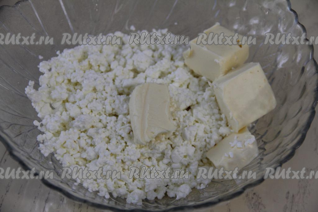 Пока заварная масса остывает, нужно в достаточно глубокой миске соединить творог и сливочное масло комнатной температуры, нарезанное на кусочки.