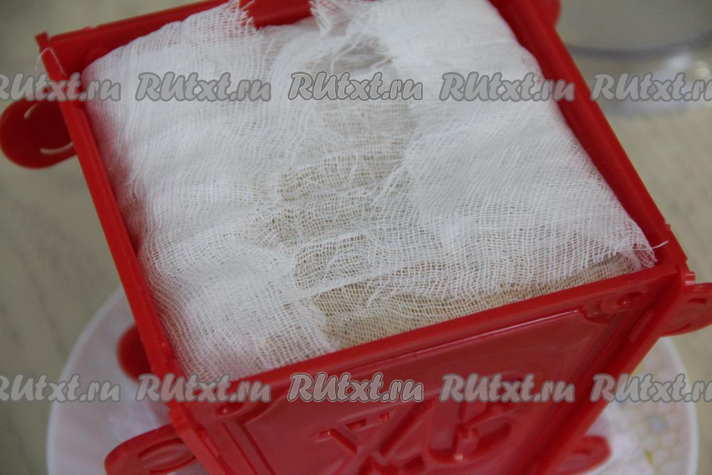 Форму для пасхи выстелить марлей, сложенной в два слоя (концы марли должны обязательно свисать с краёв формы). Взять блюдце, застелить его сложенным в несколько слоёв бумажным полотенцем (или плотной бумажной салфеткой). Бумажное полотенце будет в дальнейшем впитывать излишки влаги, которые будут выделяться из творожно-заварной массы. На застеленное блюдце поставить форму для пасхи.