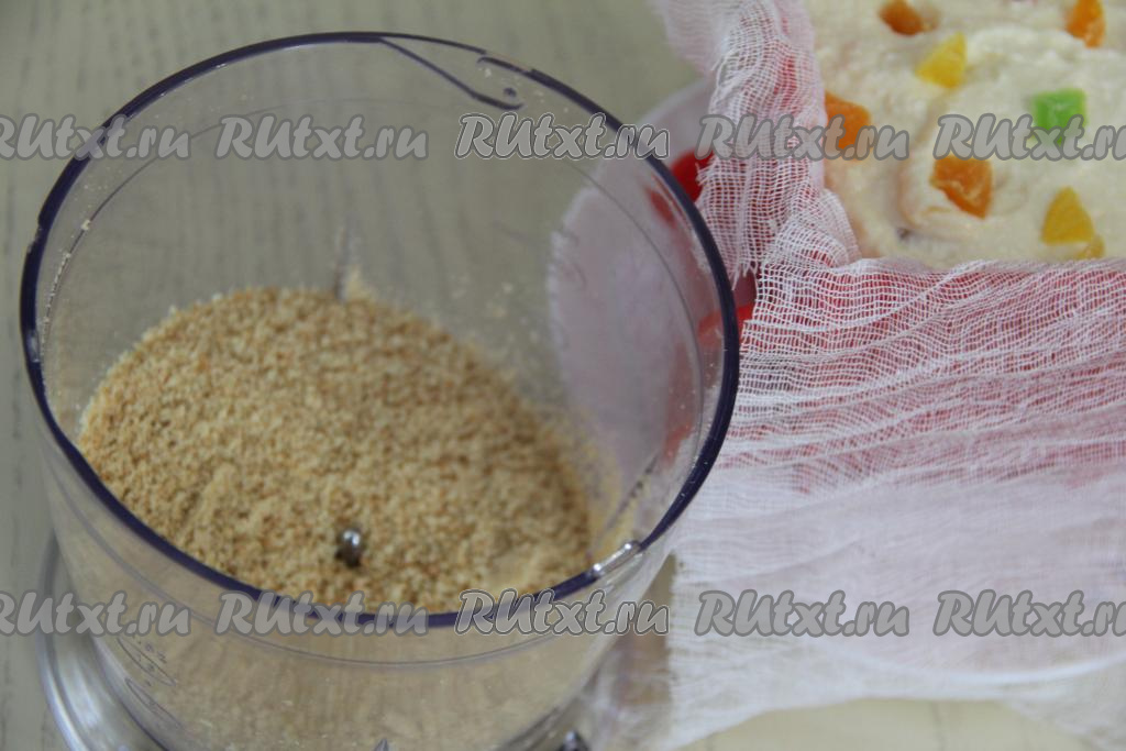 Для этого печенье нужно измельчить в измельчителе до получения мелкой крошки. Если нет измельчителя, можно сложить печенье в целлофановый пакет, завязать его, а затем прокатать скалкой несколько раз поверх пакета, чтобы печенье превратилось в мелкую крошку.