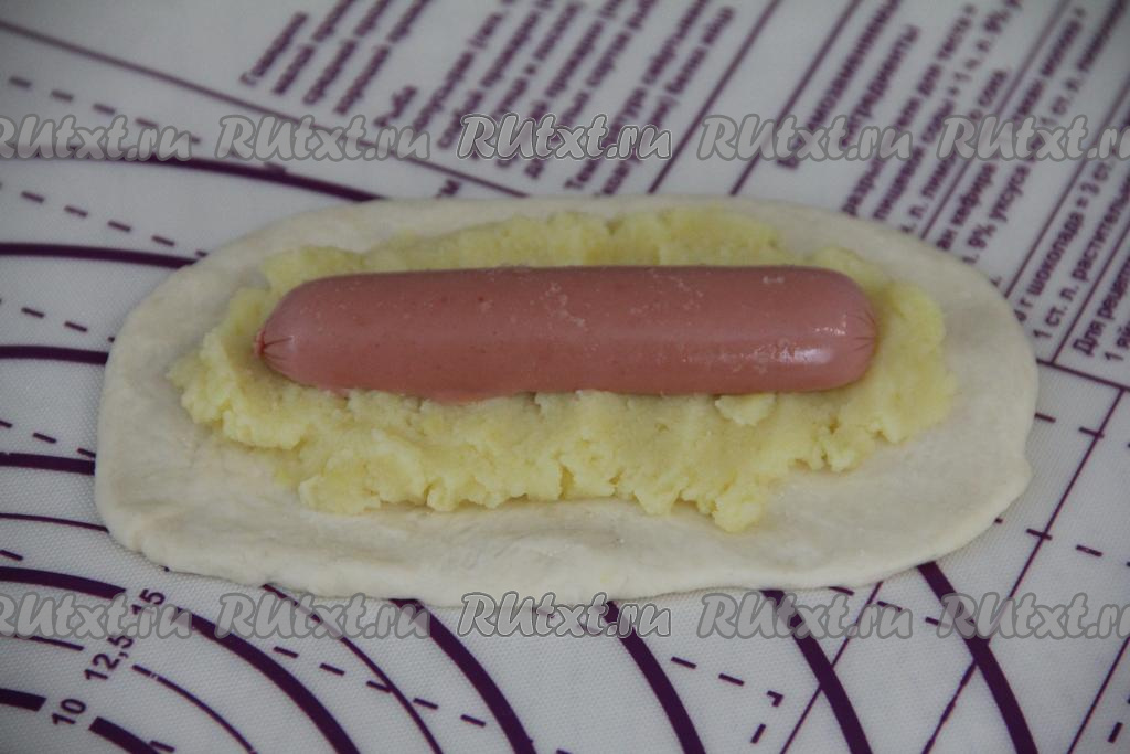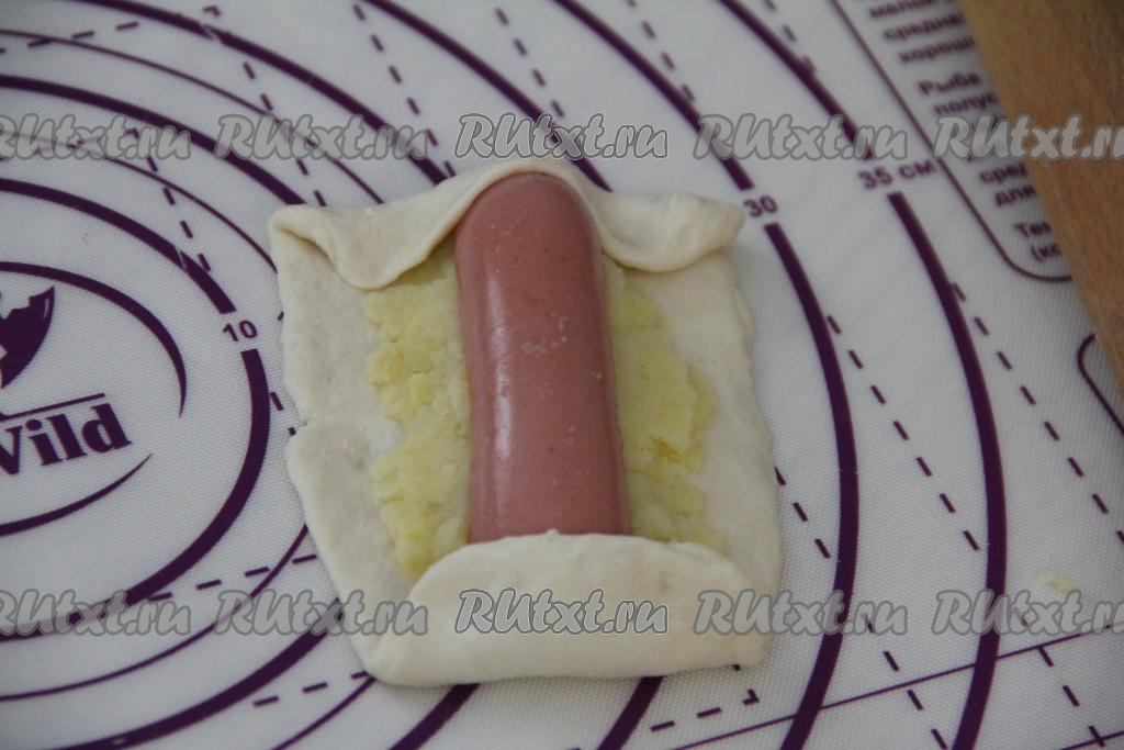 Сосиску разрезать вдоль пополам. На один пирожок будем добавлять половину сосиски. Выложить часть картофельного пюре на тесто, отступив по 1,5-2 сантиметра от краёв. Сверху на картофельное пюре выложить половинку сосиски.