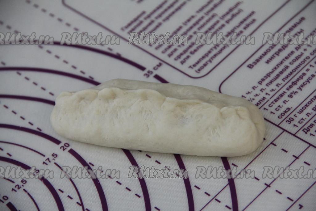 А затем скрепить широкие края овала над начинкой и хорошо защипать. Вот такой пирожок должен получиться.