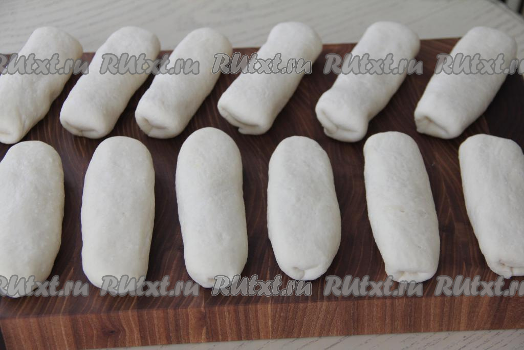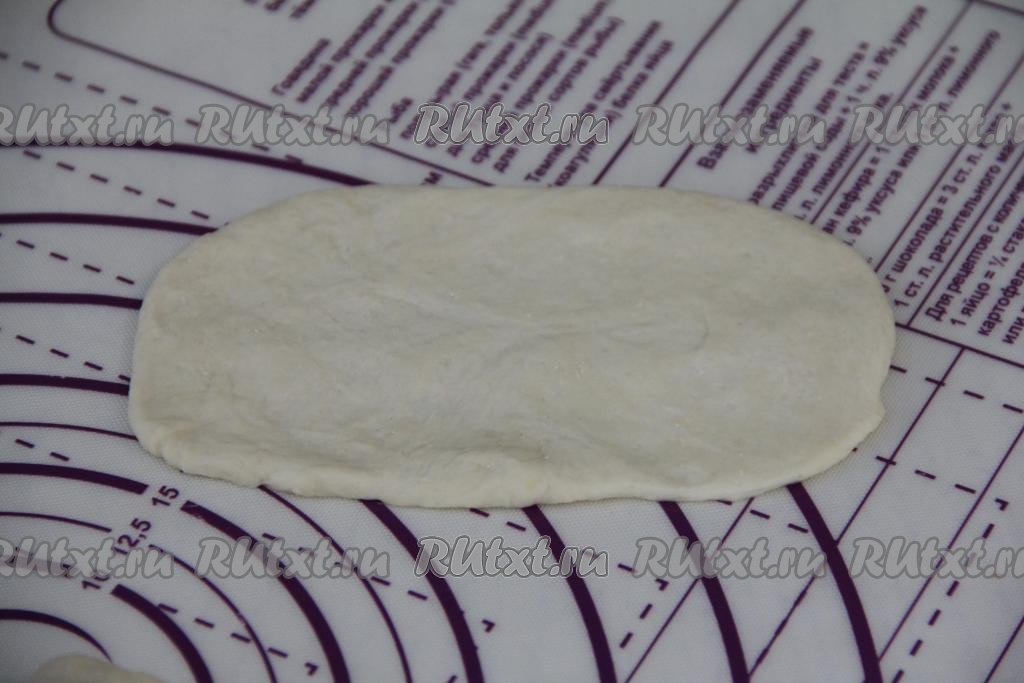 Разделить тесто на 12 равных частей. Каждую часть теста на слегка присыпанной мукой поверхности раскатать скалкой в овал, чуть больший по длине, чем длина сосиски. Толщина теста после раскатки примерно 2 миллиметра.