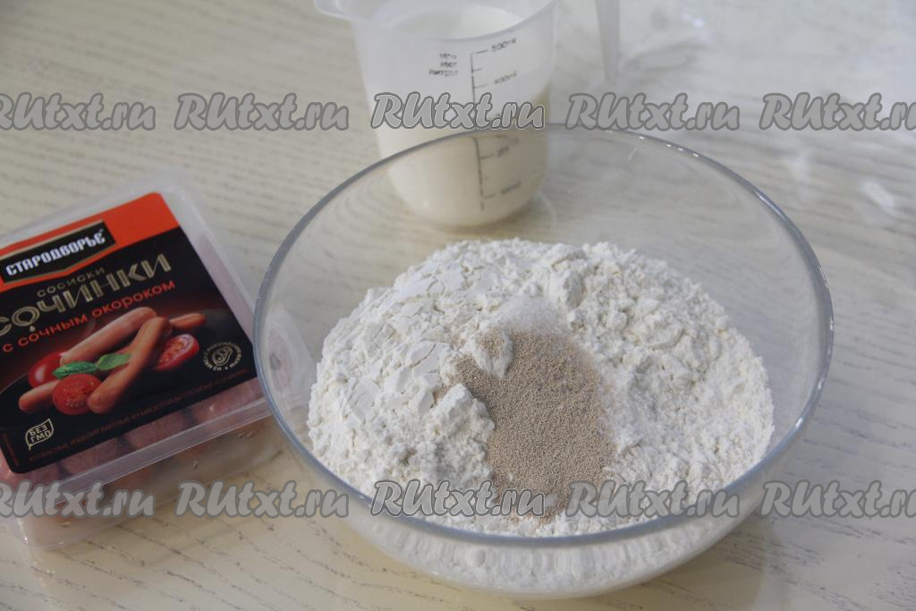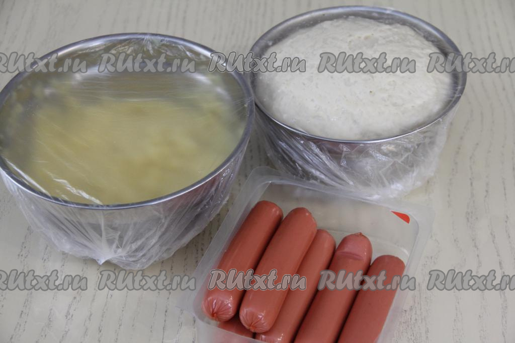 По прошествии 45 минут тесто округлится и хорошо увеличится в объёме. Сосиски очистить от слюды.