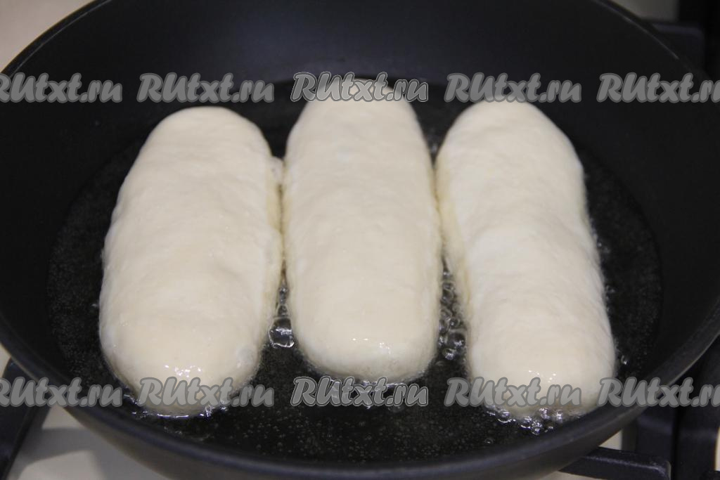 В сковороду влить достаточное количество растительного масла, очень хорошо разогреть. Выложить пирожки в сковороду швом вниз. Лучше, если масло будет покрывать пирожки хотя бы на треть по высоте.