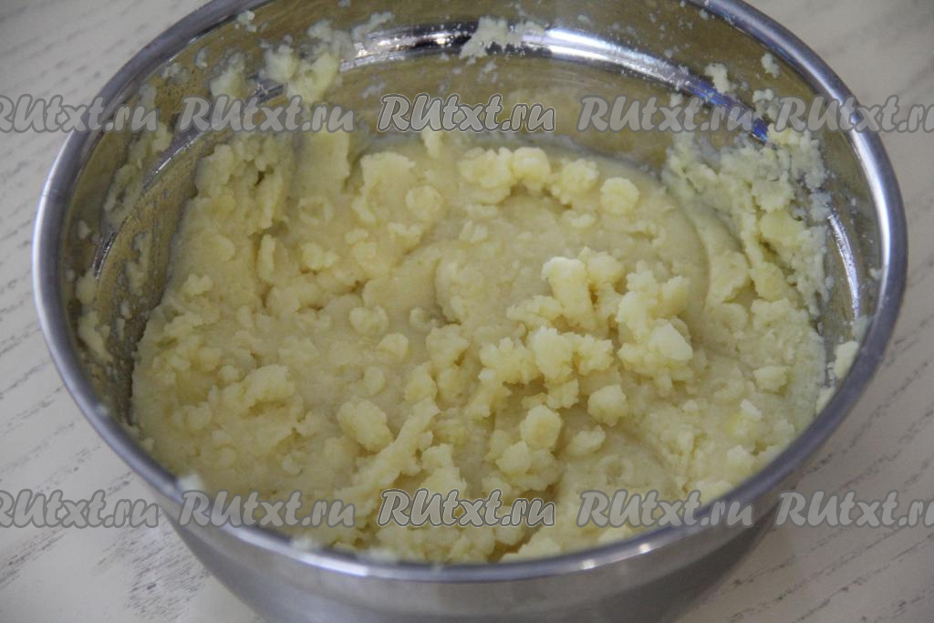 После того как варёный картофель станет мягким, снять кастрюлю с огня, лишнюю воду слить. В кастрюлю с картошкой добавить сливочное масло и пару столовых ложек молока. Размять картошку толкушкой до однородности, должно получиться достаточно плотное картофельное пюре, если нужно, подсолить.