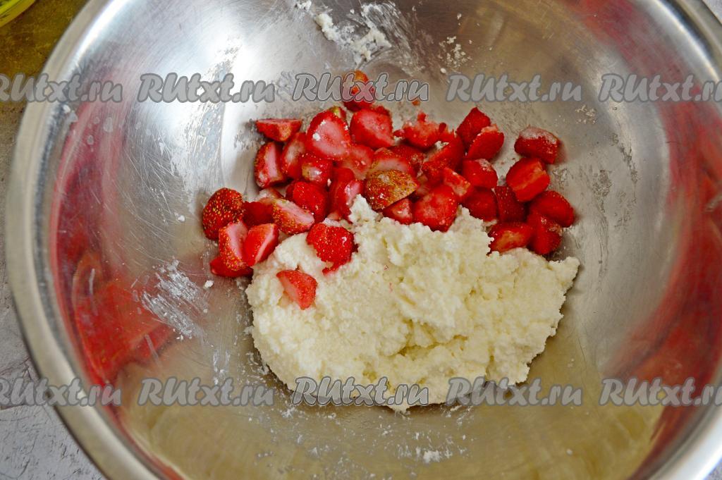В миску с творожной массой добавить нарезанную клубнику.