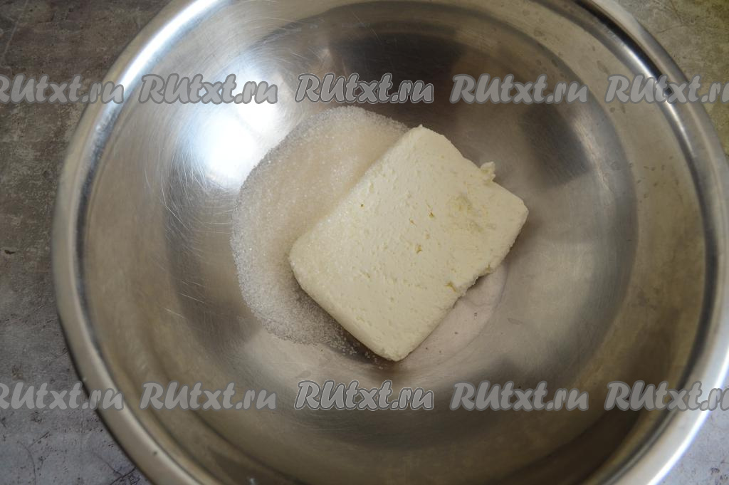 В миску выложить творог и сахар, растереть вилкой до однородности.
