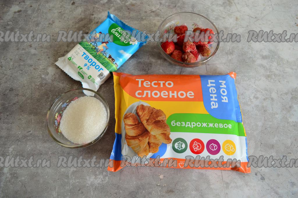 Подготовить продукты. Заранее бездрожжевое (или дрожжевое) слоёное тесто достать из морозилки, чтобы оно разморозилось. Клубнику можно взять свежую или замороженную. Свежую клубнику нужно промыть водой, убирая чашелистики, затем обсушить. Замороженную клубнику слегка разморозить, слить лишнюю воду.