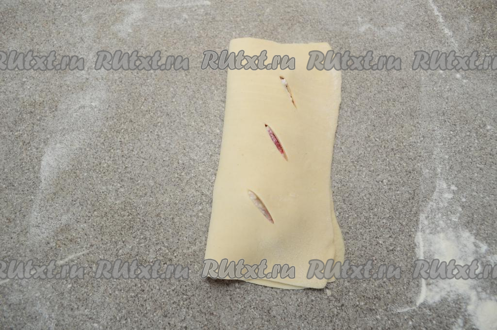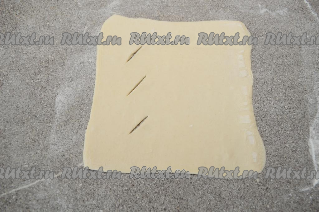 Рабочую поверхность присыпать мукой. Взять одну часть теста, раскатать в квадрат со стороной 15 сантиметров и толщиной 2 миллиметра. Ближе к левому краю квадрата, отступив от краёв, сделать 3 надреза ножом, как на фото.