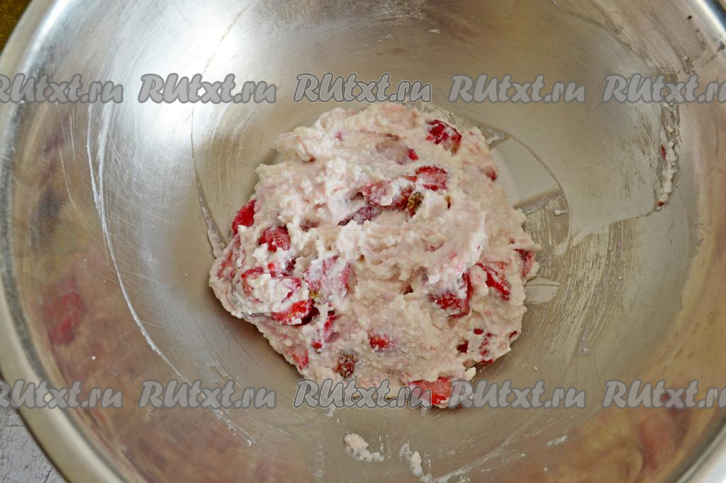 Аккуратно перемешать, вмешивая клубнику в творожную массу.