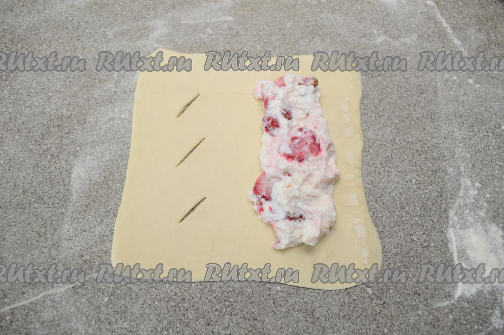 Аналогично сформировать все слойки с творогом и клубникой, выложить их на противень, застеленный пергаментом. Всего у меня получилось 8 заготовок слоек.