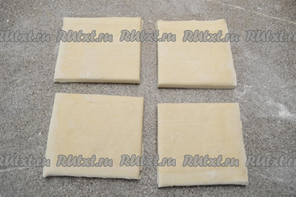У меня слоёное тесто было в двух пластах. Разрезать каждый пласт теста на 4 части.
