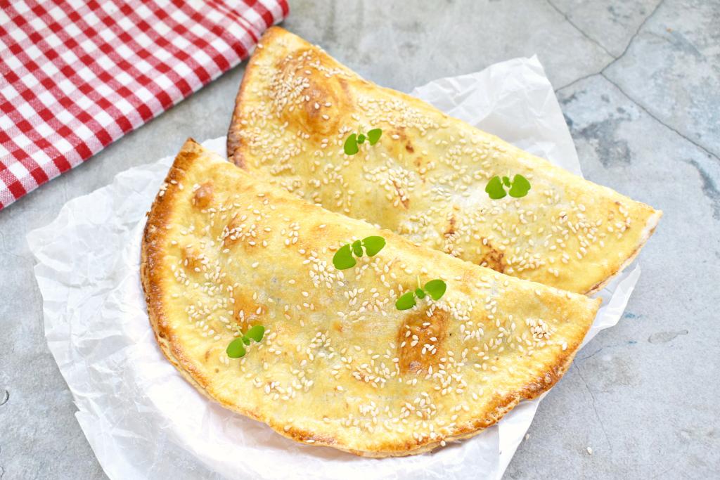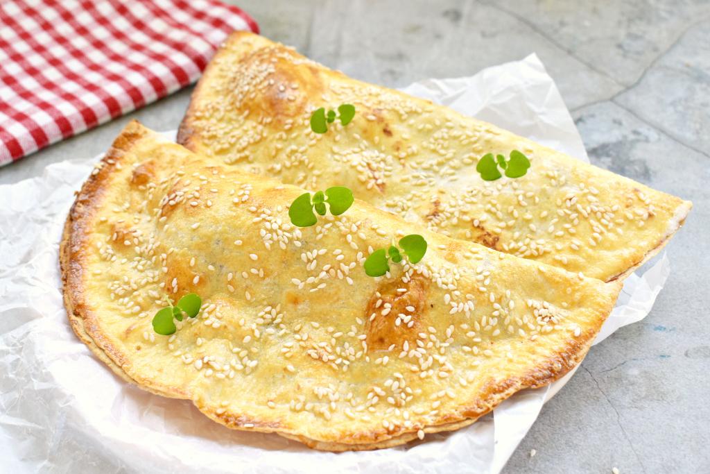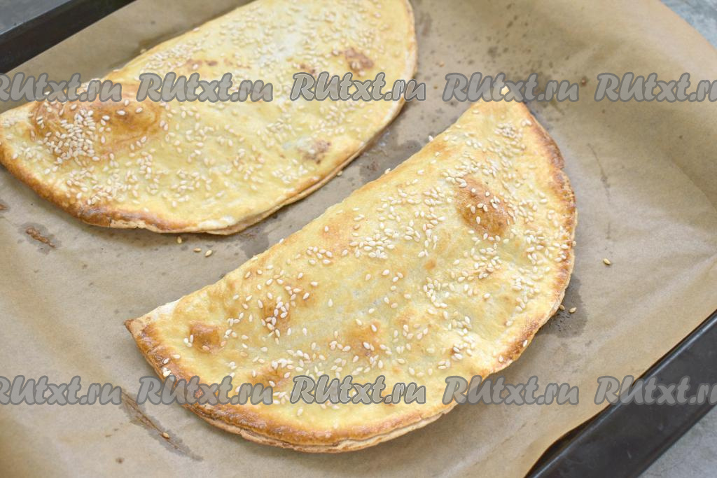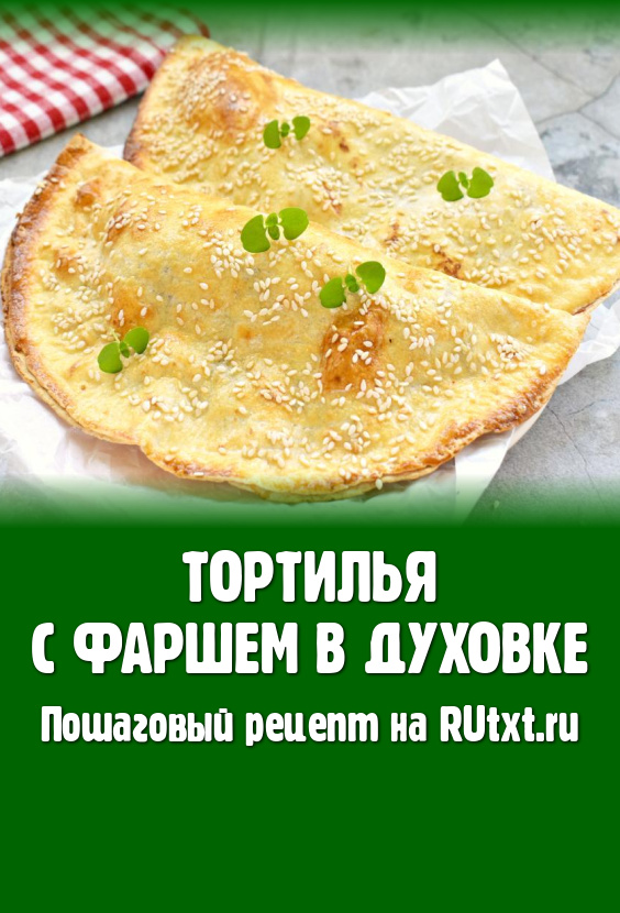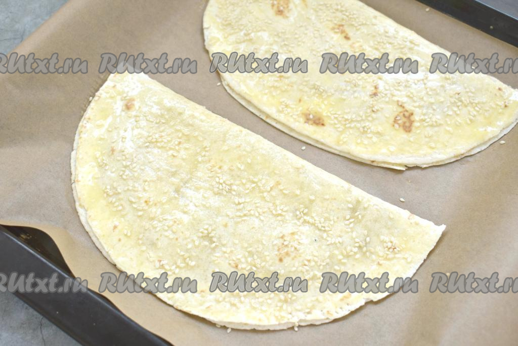 Аналогично формируем вторую тортилью с начинкой. Выкладываем тортильи с фаршем на противень, предварительно застеленный пергаментом. Поверхность тортильи смазываем яичным желтком и посыпаем кунжутом.