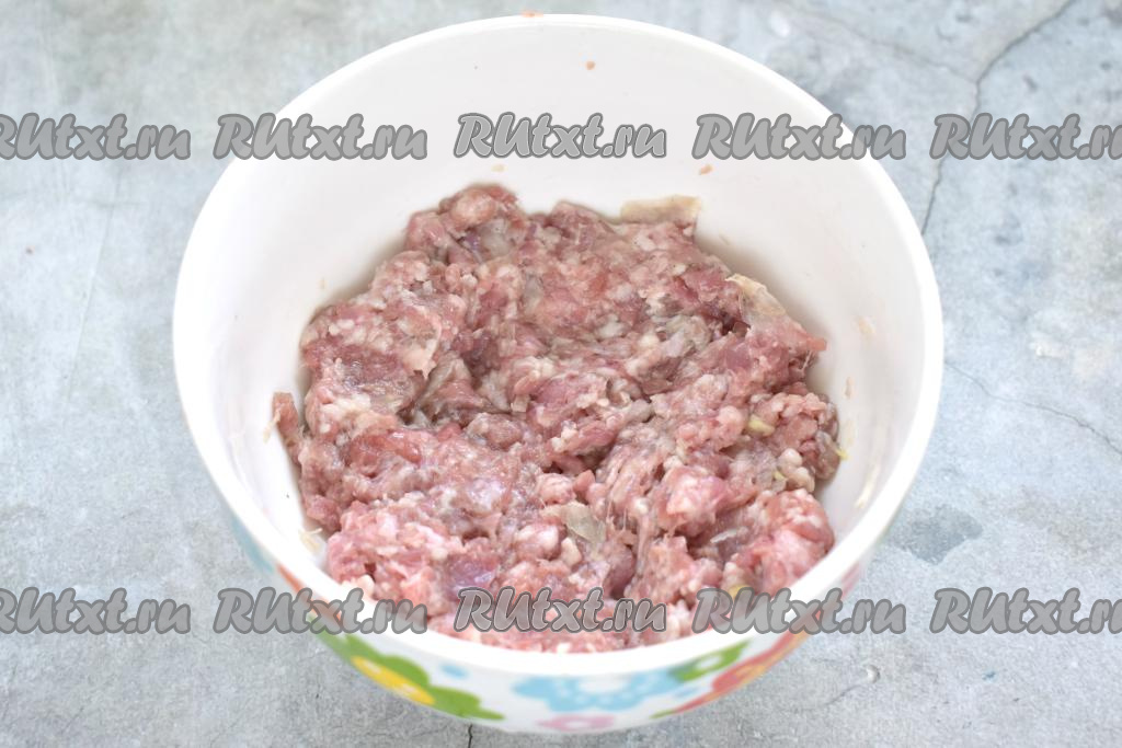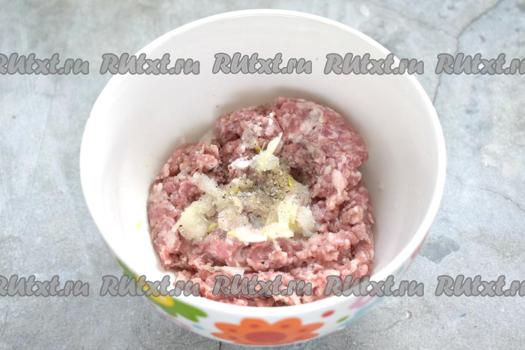 Лук очищаем, натираем на тёрке. Мясной фарш перекладываем в миску, добавляем натёртый лук, солим и перчим.