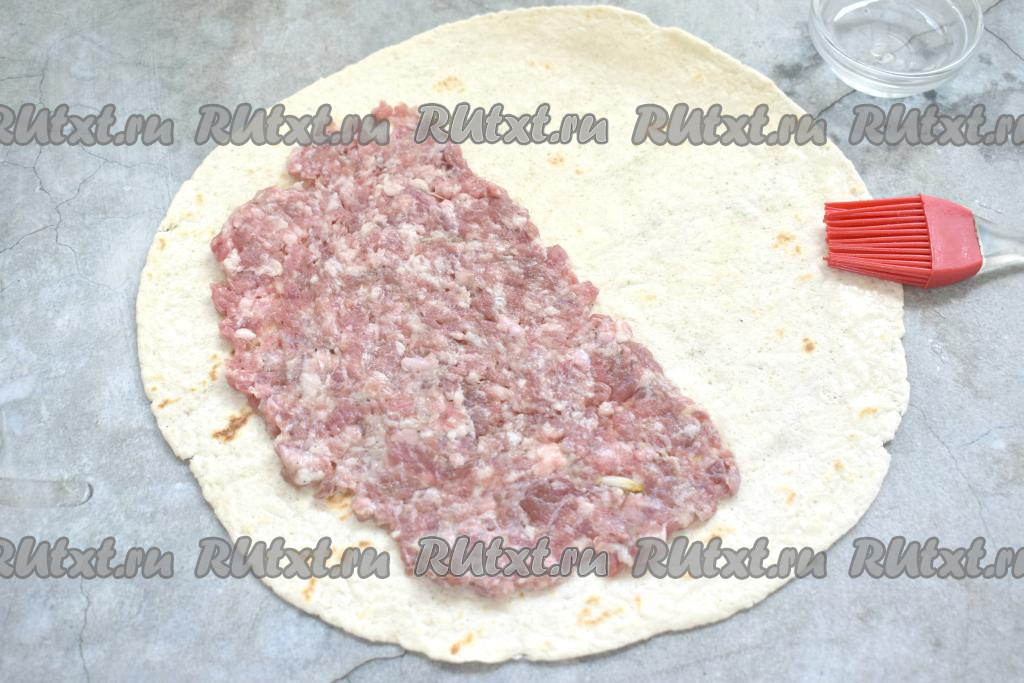 Накрываем начинку из фарша свободной стороной тортильи, края плотно прижимаем.