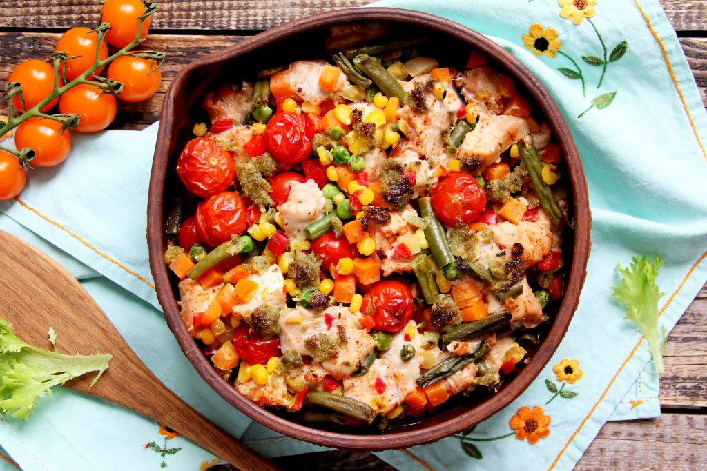 Достать форму из духовки, разложить индейку с овощной смесью по тарелкам и в горячем виде подать сытное, яркое, вкусное блюдо к столу.