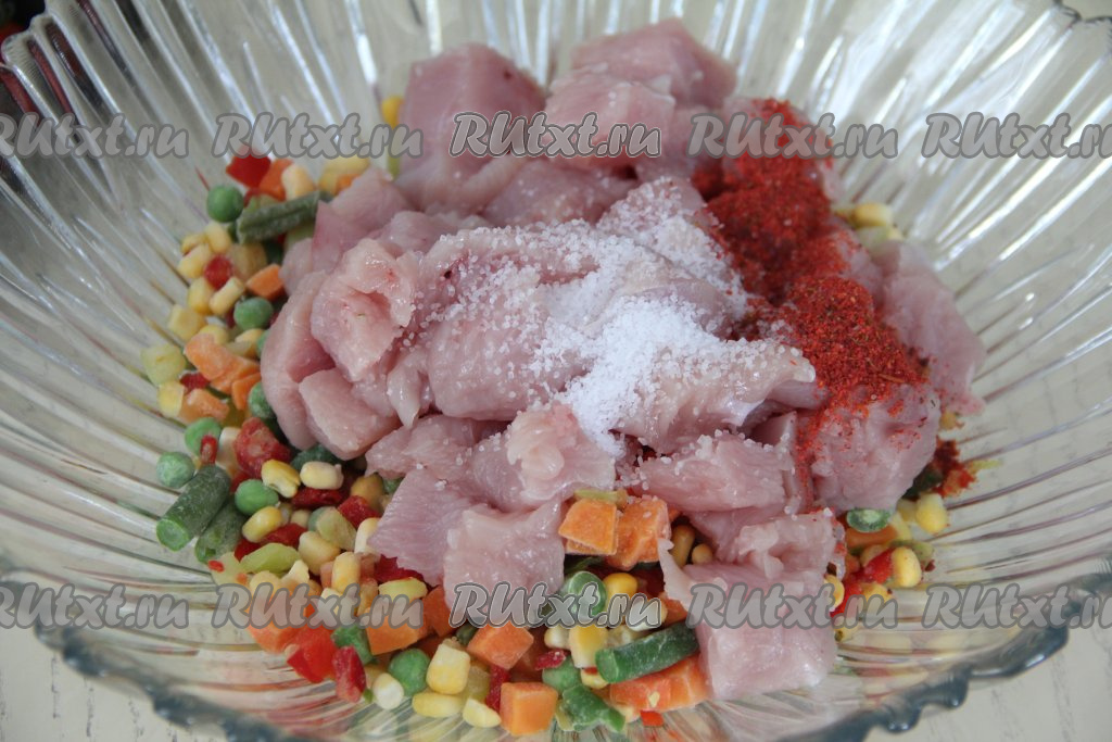 Индейку нарезать на кубики размером 2 сантиметра на 2 сантиметра. В глубокой миске соединить нарезанное мясо и замороженные овощи, добавить соль и специи по вкусу.