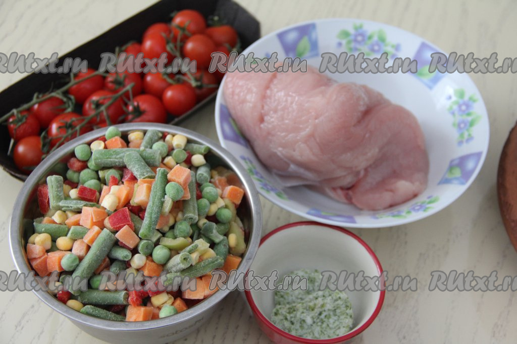 Подготовить продукты. Мексиканскую овощную смесь размораживать не нужно. Филе индейки вымыть, обсушить. Помидоры вымыть. Сливочное масло можно взять обычное, я решила взять сливочное масло, смешанное с зеленью и чесноком.