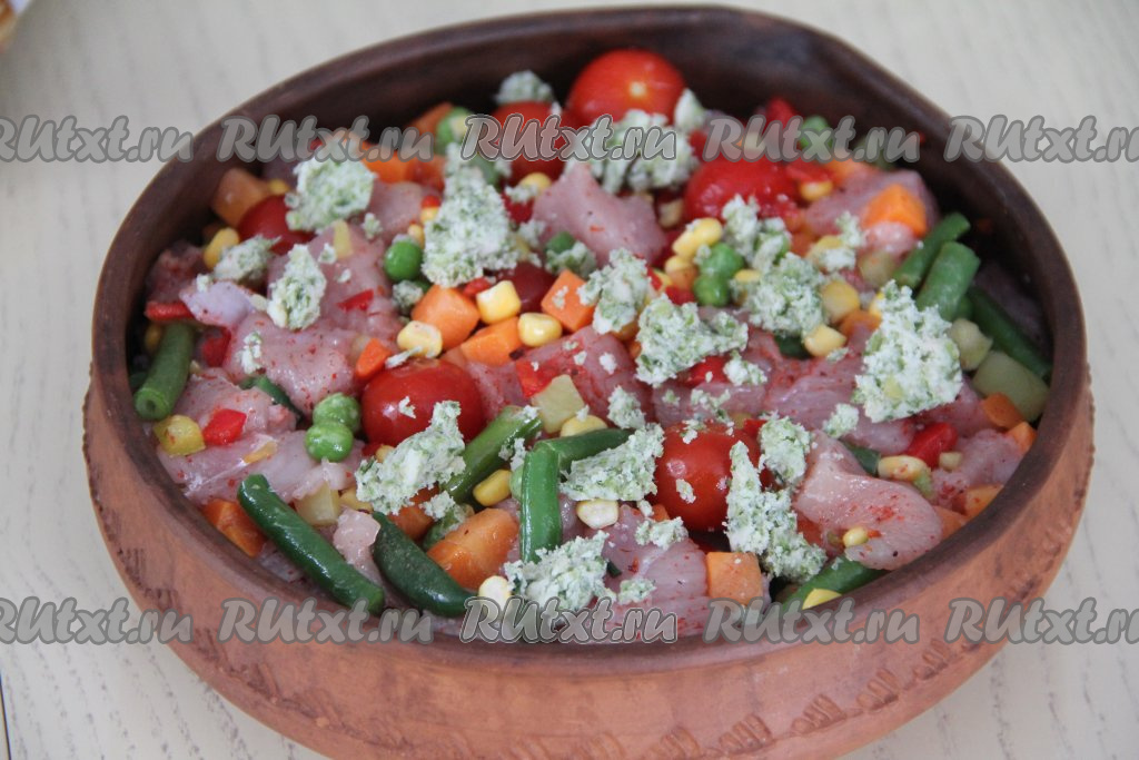 Перемешать индейку с овощами и специями. Переложить в жаропрочную форму. Поверх мяса с овощами разложить кусочки обычного (или пряного) сливочного масла.