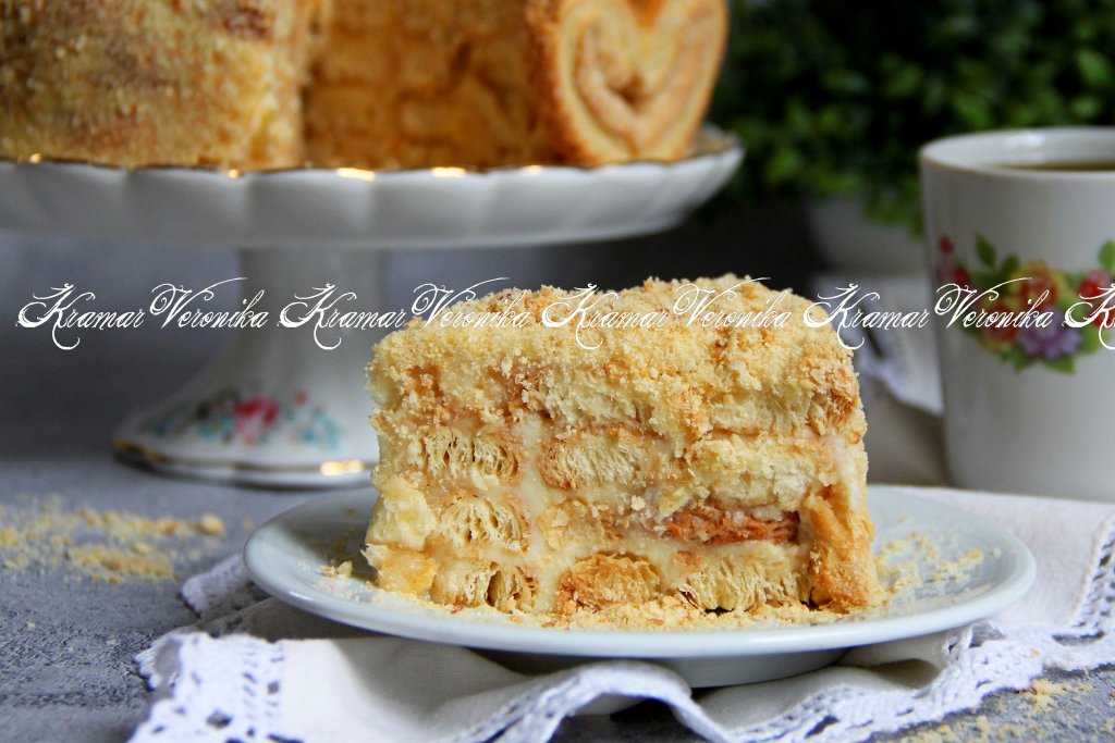 Я ещё украсила торт несколькими печенюшками. А затем вкусный, нежный, хорошо пропитанный торт "Наполеон", приготовленный из слоёного печенья "Ушки" и заварного крема, нарезать на кусочки и подать к столу.