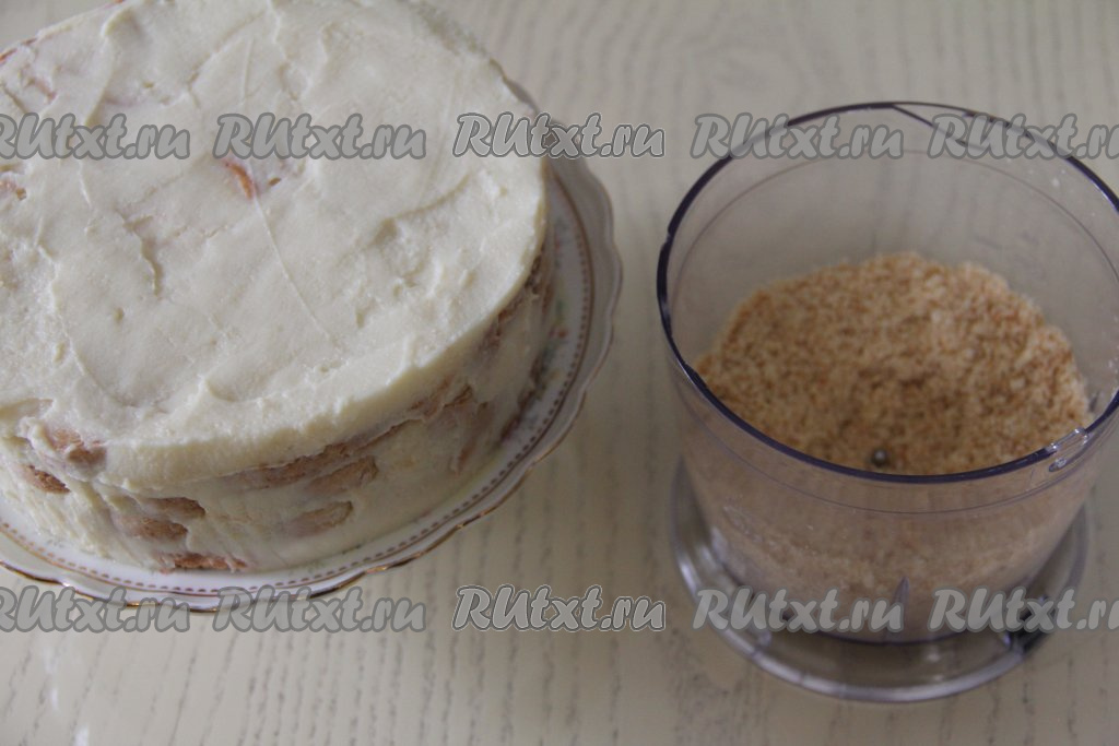 Торт поставить в холодильник на ночь. Затем снять кулинарное кольцо. 5 печенюшек пробить в измельчителе в мелкую крошку.