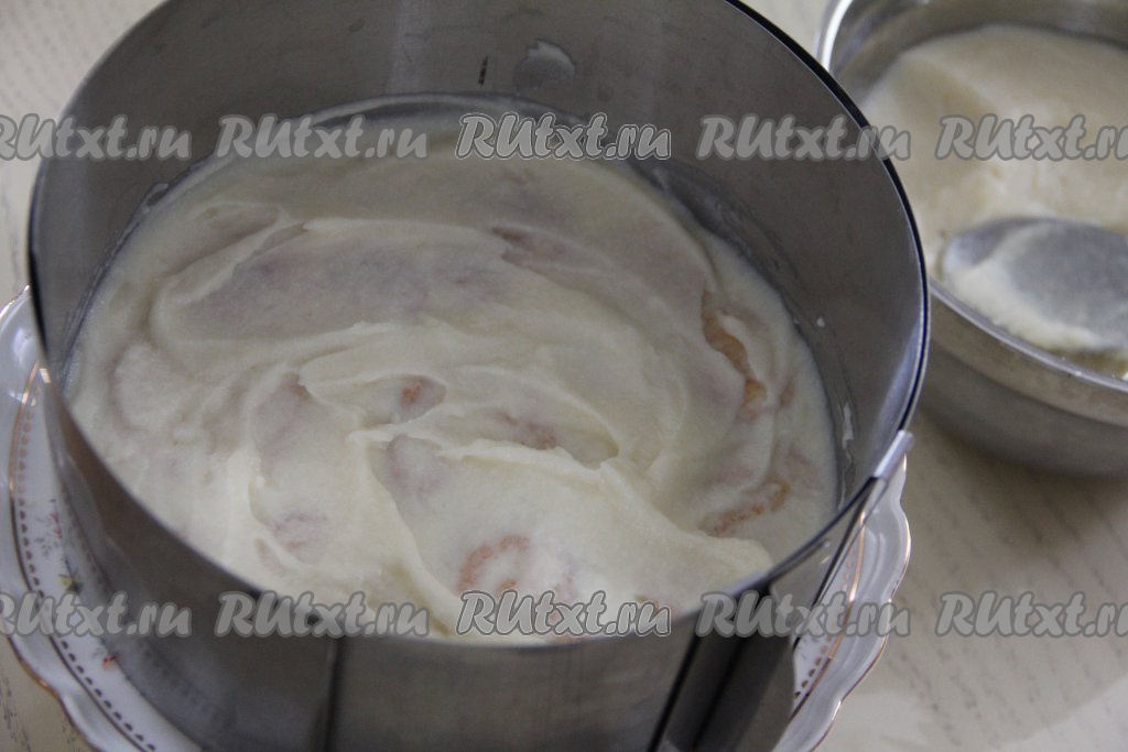 Выложить часть заварного крема поверх печенья и равномерно распределить. Крем должен заполнить пустоты и покрыть печенье.