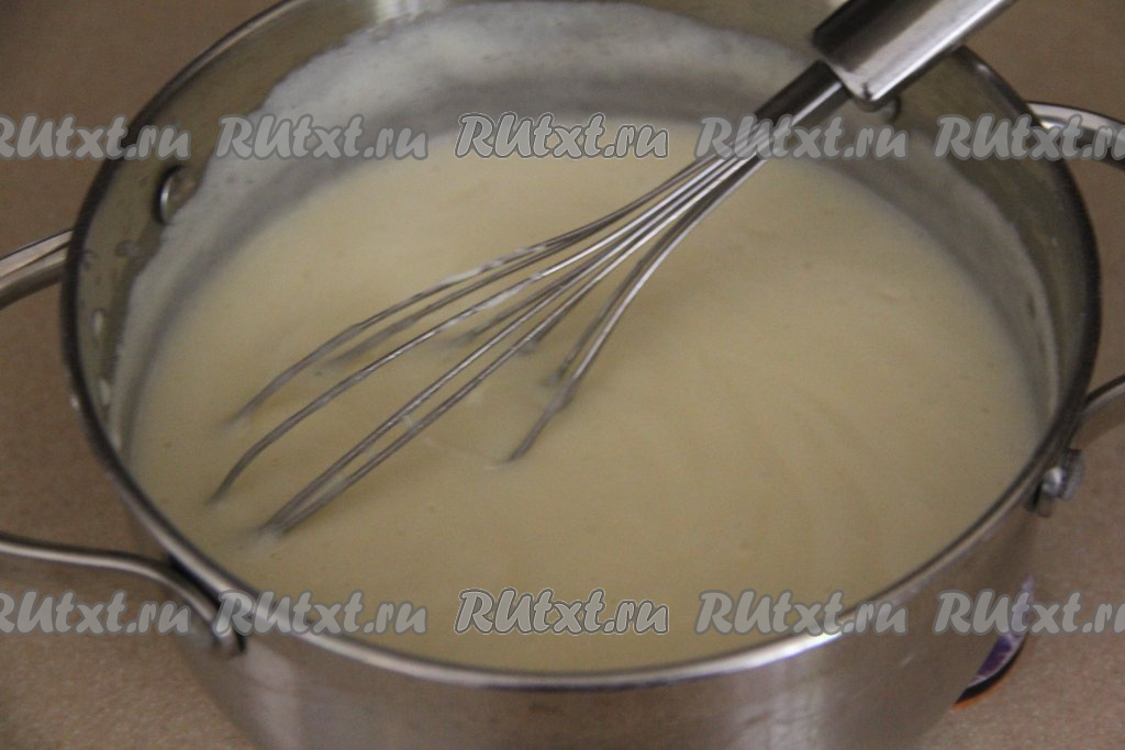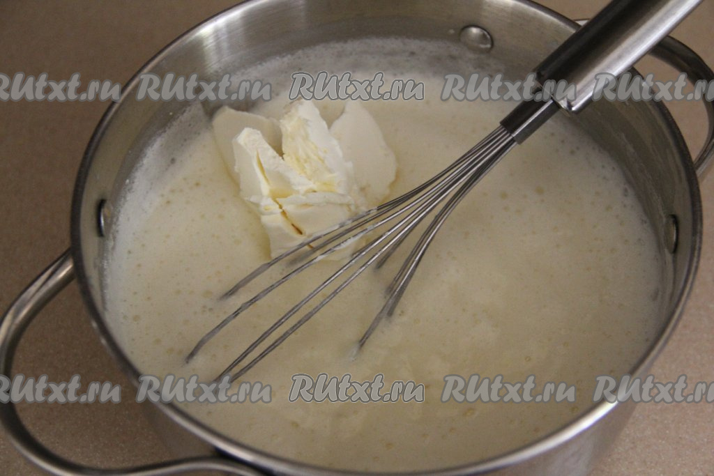 Непрерывно перемешивая крем венчиком, довести его до кипения и варить, постоянно помешивая и немного уменьшив огонь, 2-3 минуты (до загустения крема). Затем снять кастрюлю с огня, дать крему немного остыть и добавить мягкое сливочное масло.