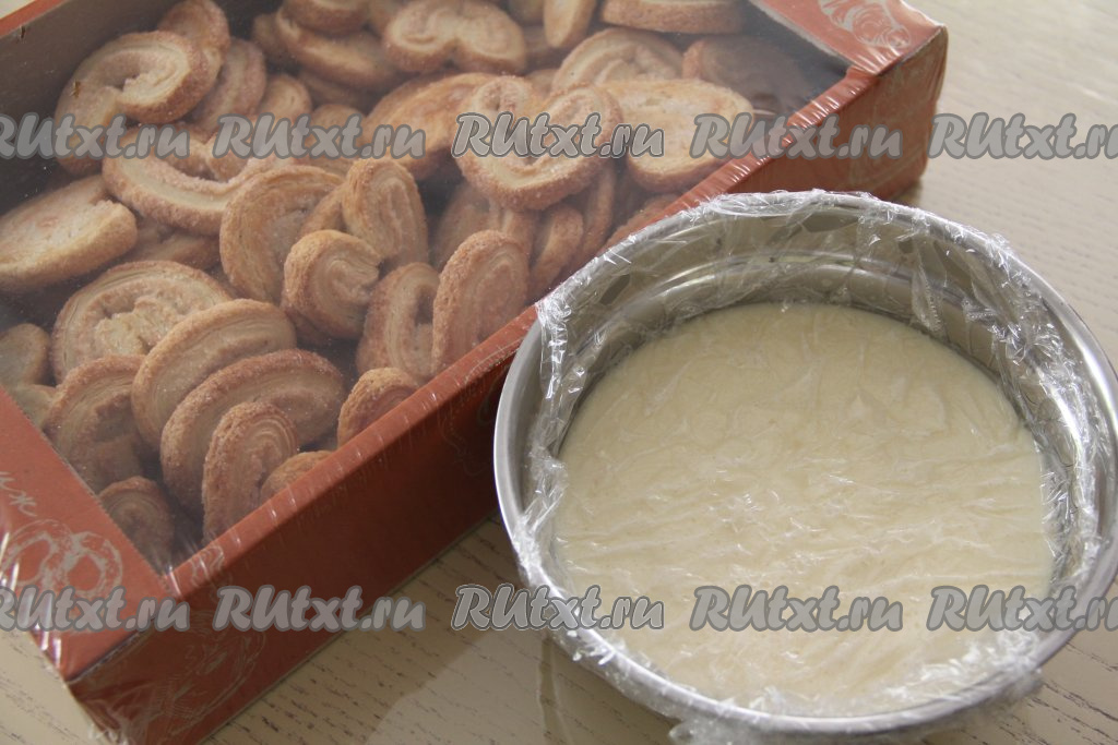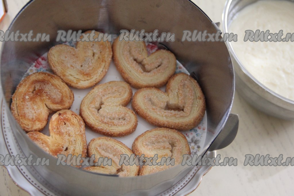После того как крем хорошо охладится, можно будет приступать к формированию торта. Для этого нужно кулинарное кольцо (я взяла диаметром 19 сантиметров), установить на тортовницу (или на плоскую тарелку), выложить несколько штук слоёного печенья "Ушки" в один слой.