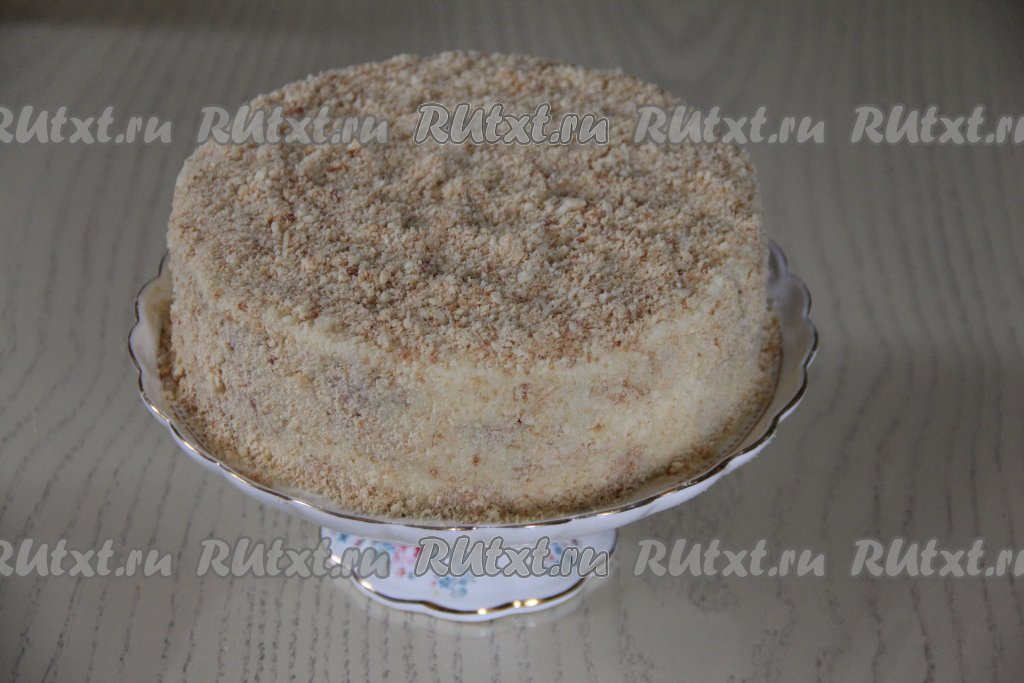 Верх и бока торта "Напалеон", приготовленного без выпечки, обсыпать измельчённым печеньем "Ушки".