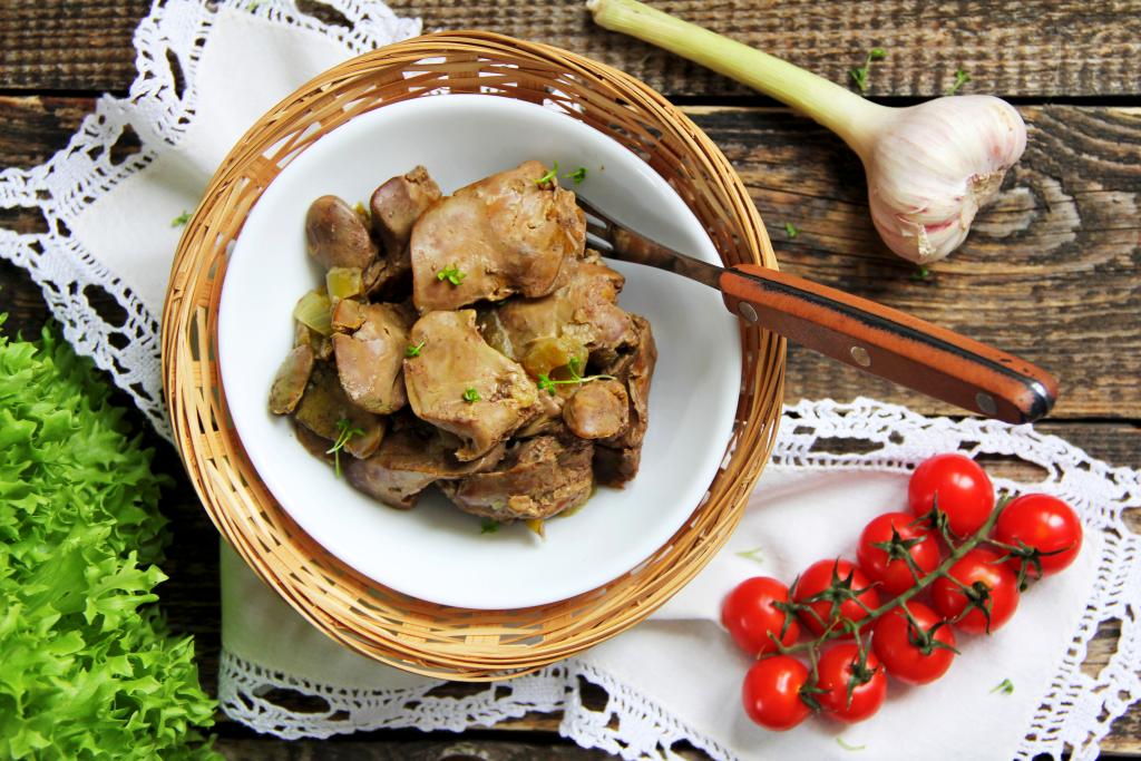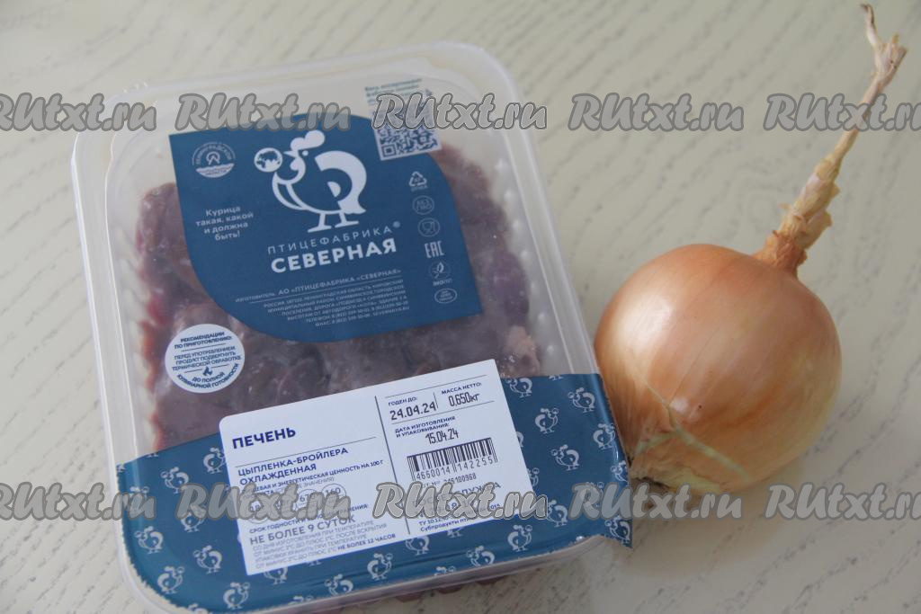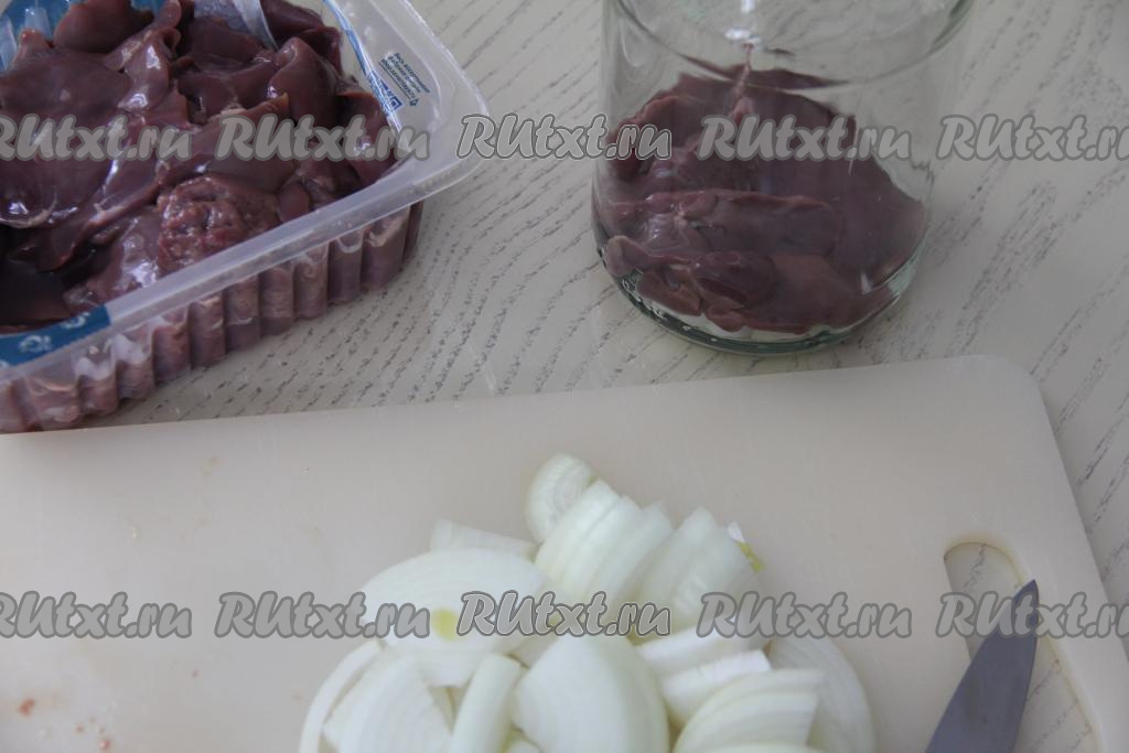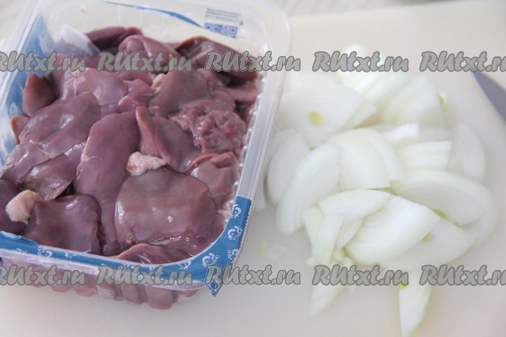 Куриную печень промыть водой. Лук почистить и нарезать на полукольца.