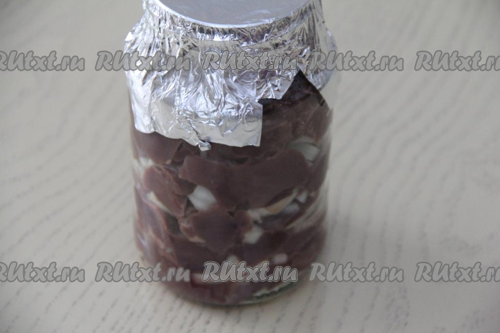 В чистую литровую банку выложить слой печени, присолить по вкусу. Следующим идёт слой нарезанного лука, который тоже нужно посолить по вкусу. Так, чередуя слои печени и лука, наполнить банку, не забывая присаливать слои.