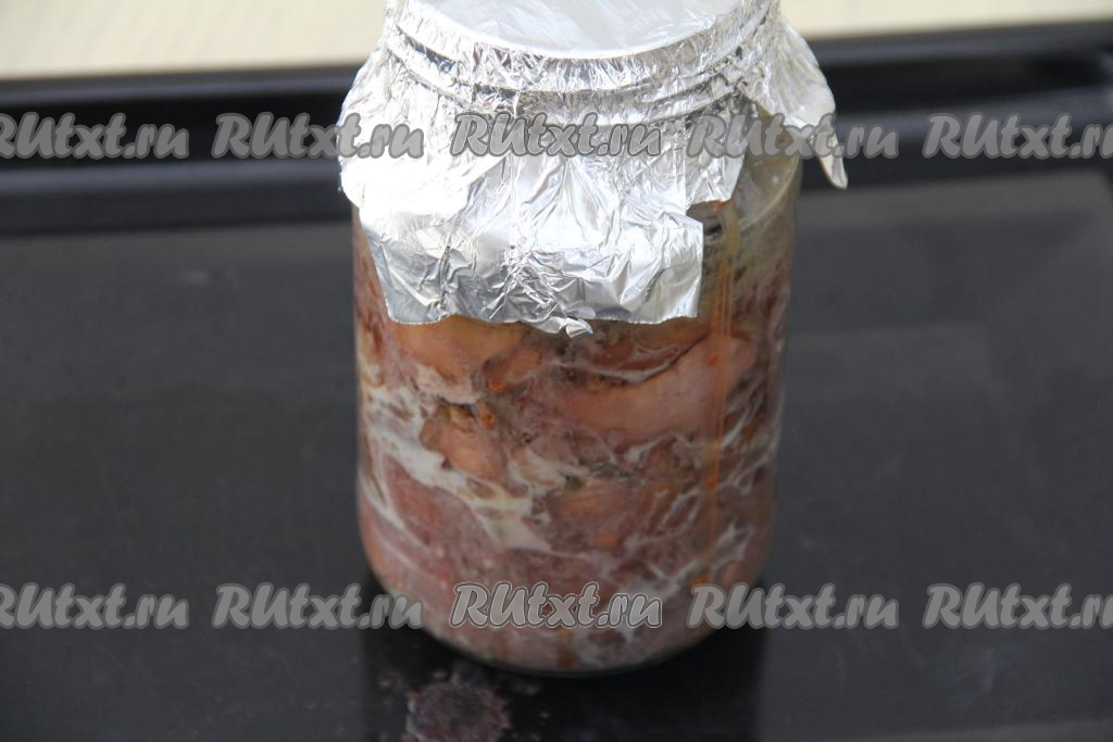 Горлышко банки закрыть двумя слоями фольги. Поставить банку на противень и поместить в холодную духовку. Выставить температуру духовки 200 градусов.