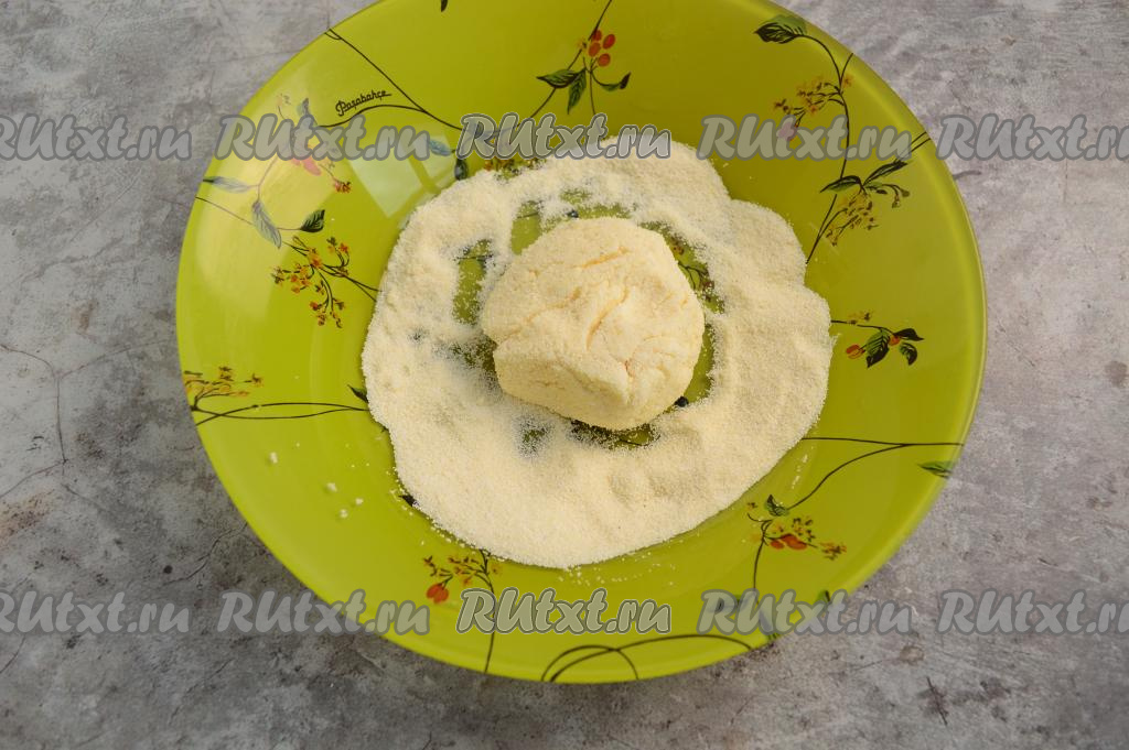 На тарелку насыпать 2 столовых ложки манки. Зрительно разделить творожное тесто на 4 равных части. Влажными руками из каждой части теста сформировать круглый сырник, обвалять его со всех сторон в манке.