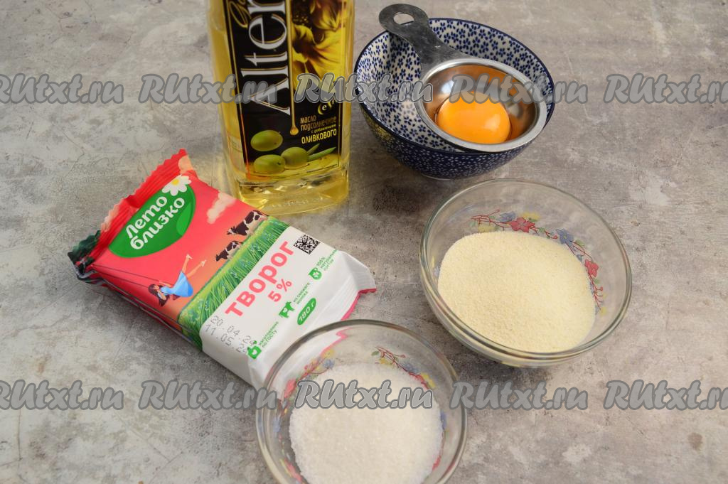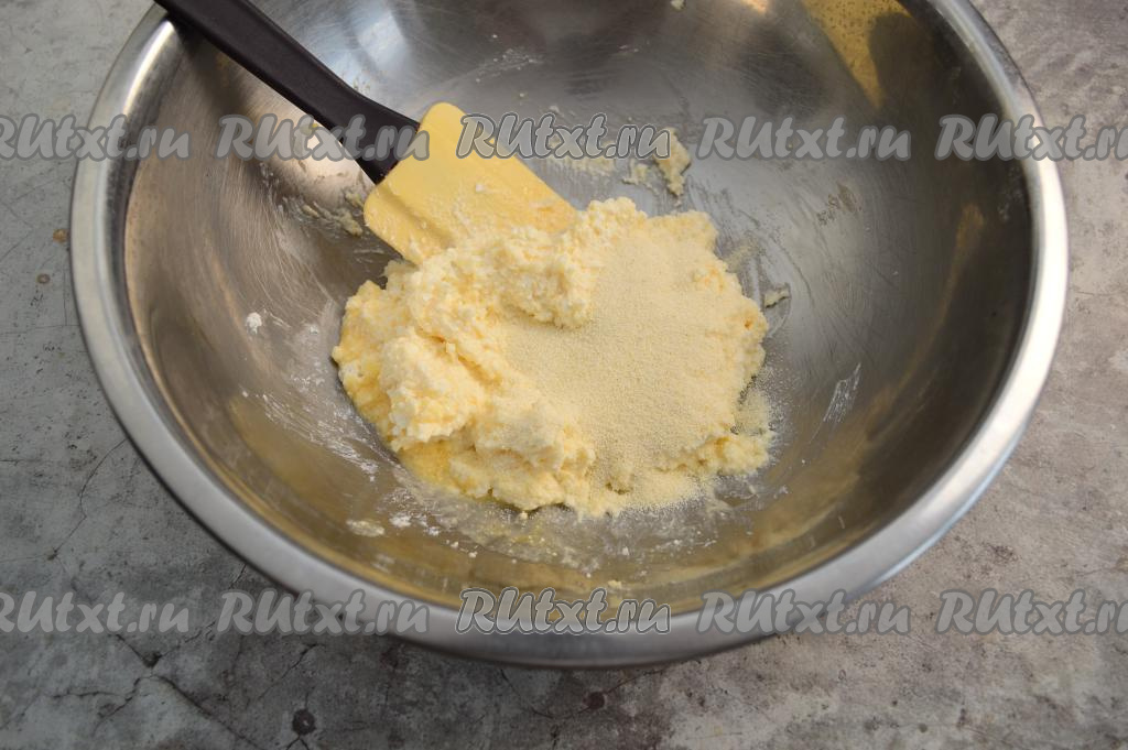 Смешать творог, желток и сахар до однородности лопаткой (или вилкой). Всыпать манную крупу.