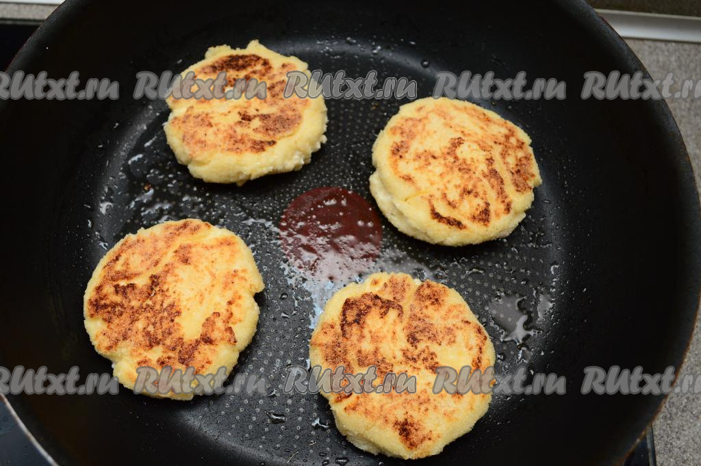 Затем сырники аккуратно перевернуть и обжарить с другой стороны ещё 2-3 минуты (до зарумянивания снизу).