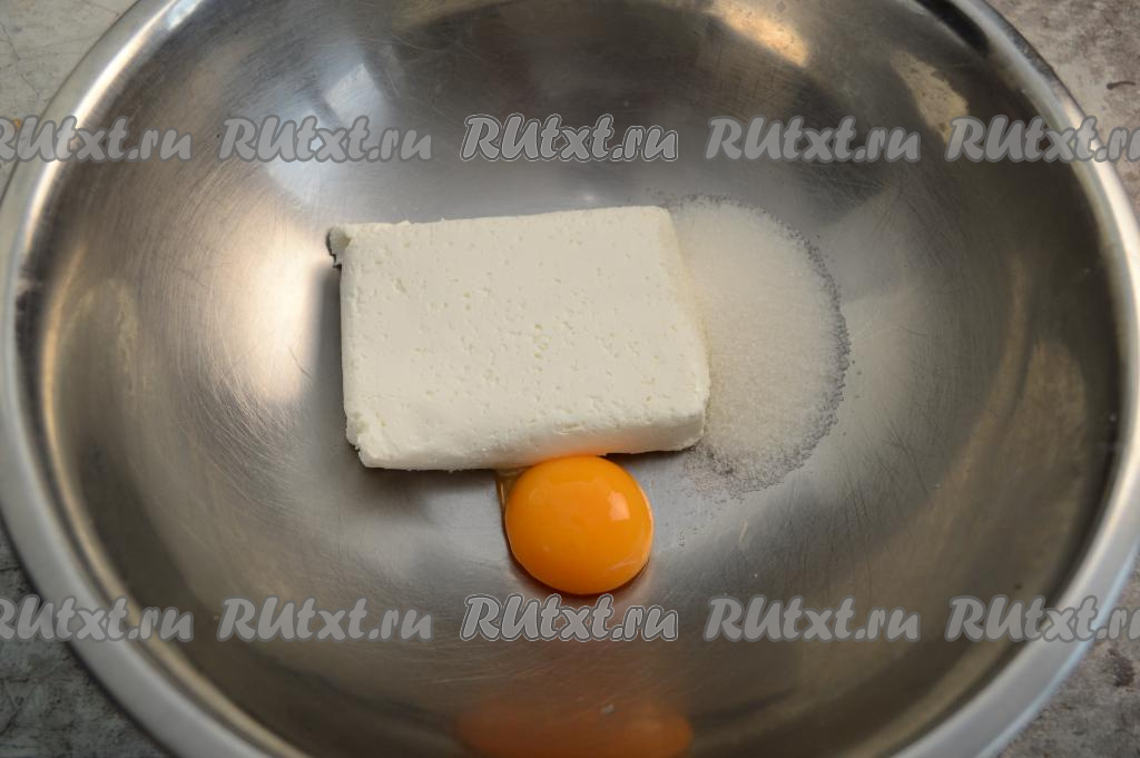 В глубокую миску выложить творог и яичный желток, всыпать сахар.