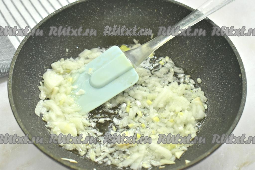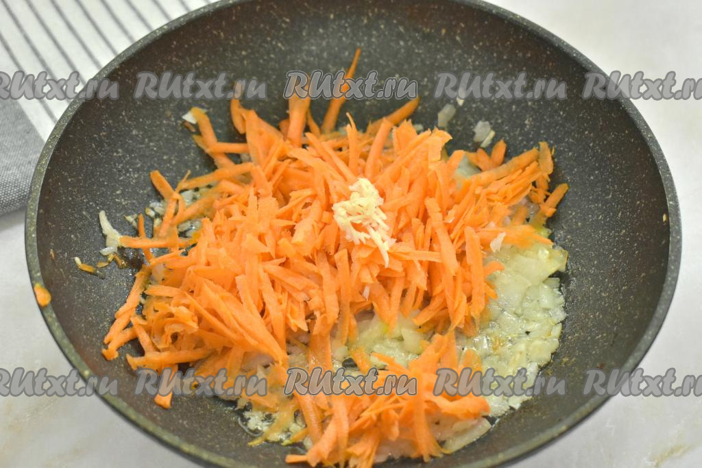 К обжаренному луку добавляем морковку, натёртую на крупной тёрке, и чеснок, пропущенный через пресс (или натёртый на мелкой тёрке), перемешиваем и обжариваем, иногда помешивая, 4-5 минут (до мягкости моркови). А затем убираем с огня.