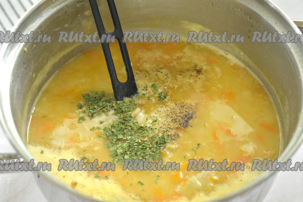 После того как горох станет мягким, выкладываем в кастрюлю обжаренные овощи со сковороды, перемешиваем, даём закипеть и варим на небольшом огне минут 5-7. В конце приготовления гороховый суп по вкусу перчим, если нужно, досаливаем, добавляем зелень, доводим до кипения, провариваем 1 минуты и убираем с огня. Если на ваш взгляд суп получился слишком густым, тогда сразу после того как поперчили, влейте в кастрюлю немного воды, доведите до кипения и проварите на небольшом огне минуты 2.