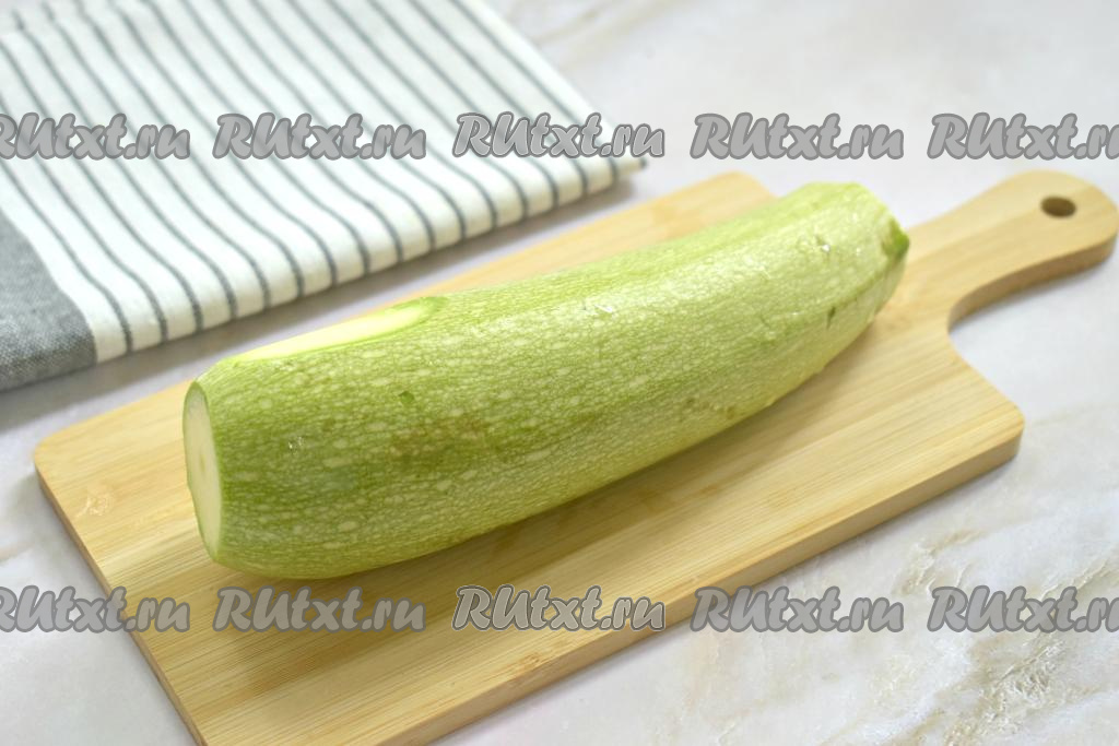 Для приготовления гренок я взяла небольшой молодой кабачок. Моем кабачок, срезаем кончики с двух сторон. У молодого кабачка тонкая кожура и мелкие семечки, поэтому очищать кабачок я не стала. Если вы взяли кабачок с жестковатой кожурой и крупными семенами, тогда удалите семена и срежьте кожуру.
