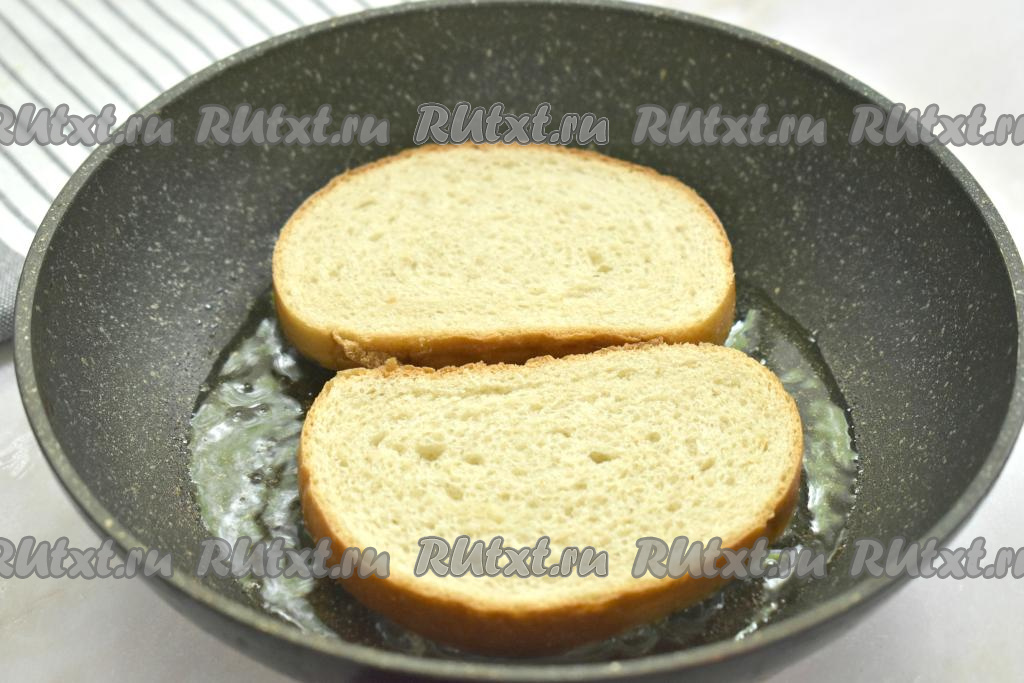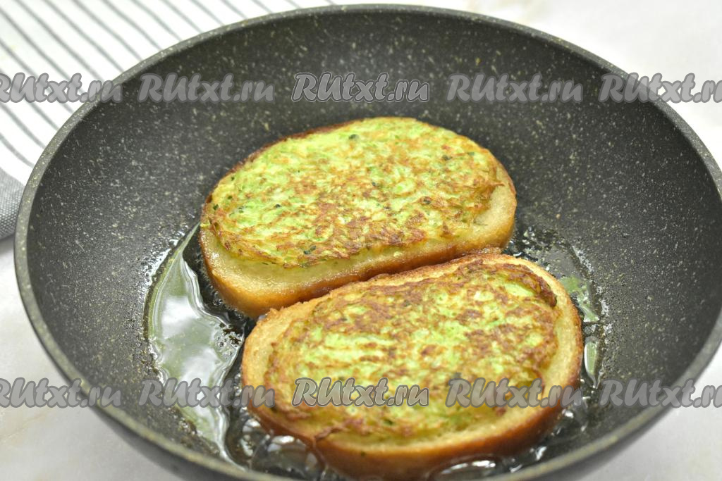 Разогреваем на сковороде растительное масло. Помещаем в горячее масло ломтики батона кабачковой стороной вниз (кабачковая масса хорошо держится и не сползает с батона), жарим на среднем огне минуты 3-4 (до подрумянивания кабачков).