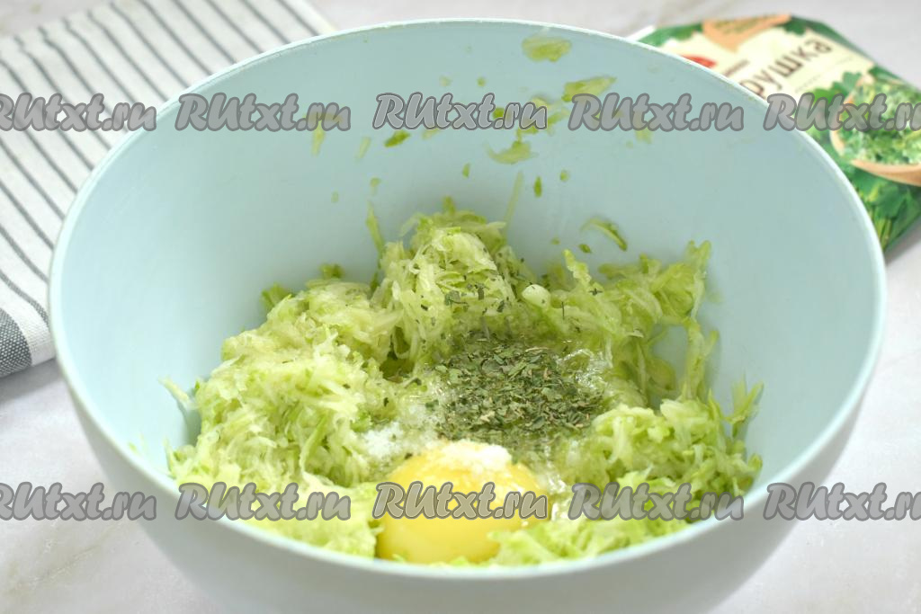 В кабачковую массу разбиваем яйцо, по вкусу солим, по желанию, всыпаем сушёную зелень.