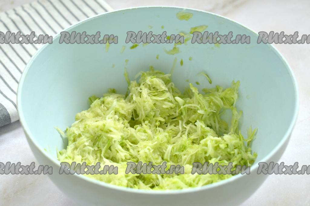 250 грамм подготовленного кабачка натираем на мелкой тёрке. Получившуюся кабачковую массу хорошо отжимаем руками (выделившийся сок нам не понадобится).