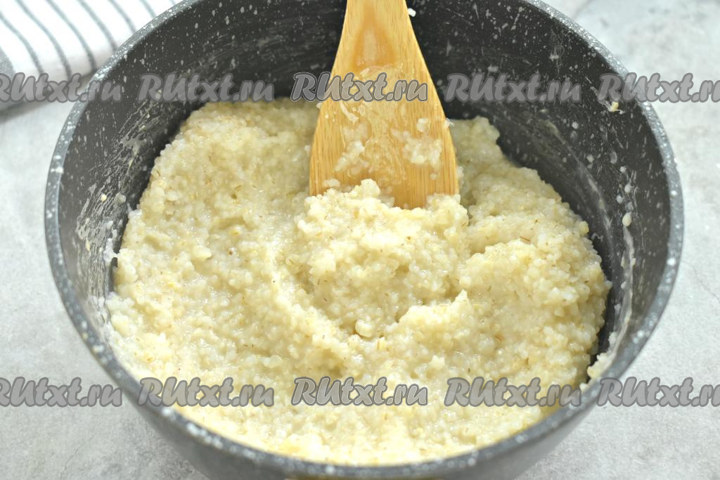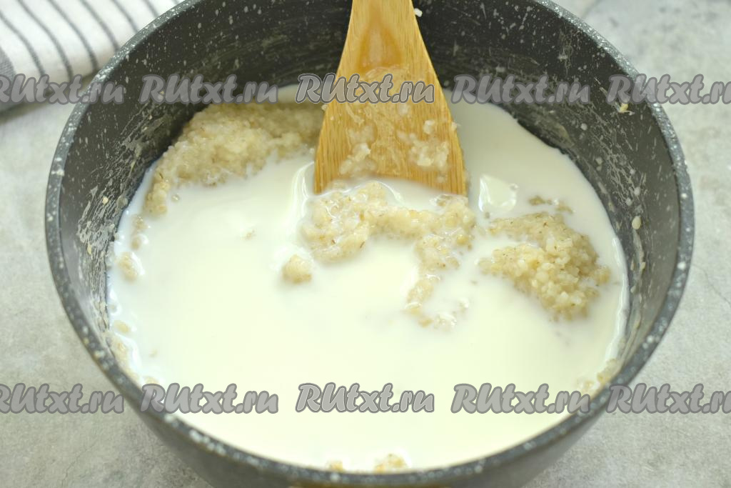 В варёную крупу вливаем молоко и снова доводим до кипения. После закипания готовим ячневую кашу на небольшом огне ещё 7-10 минут. Не забываем кашу перемешивать во время варки.